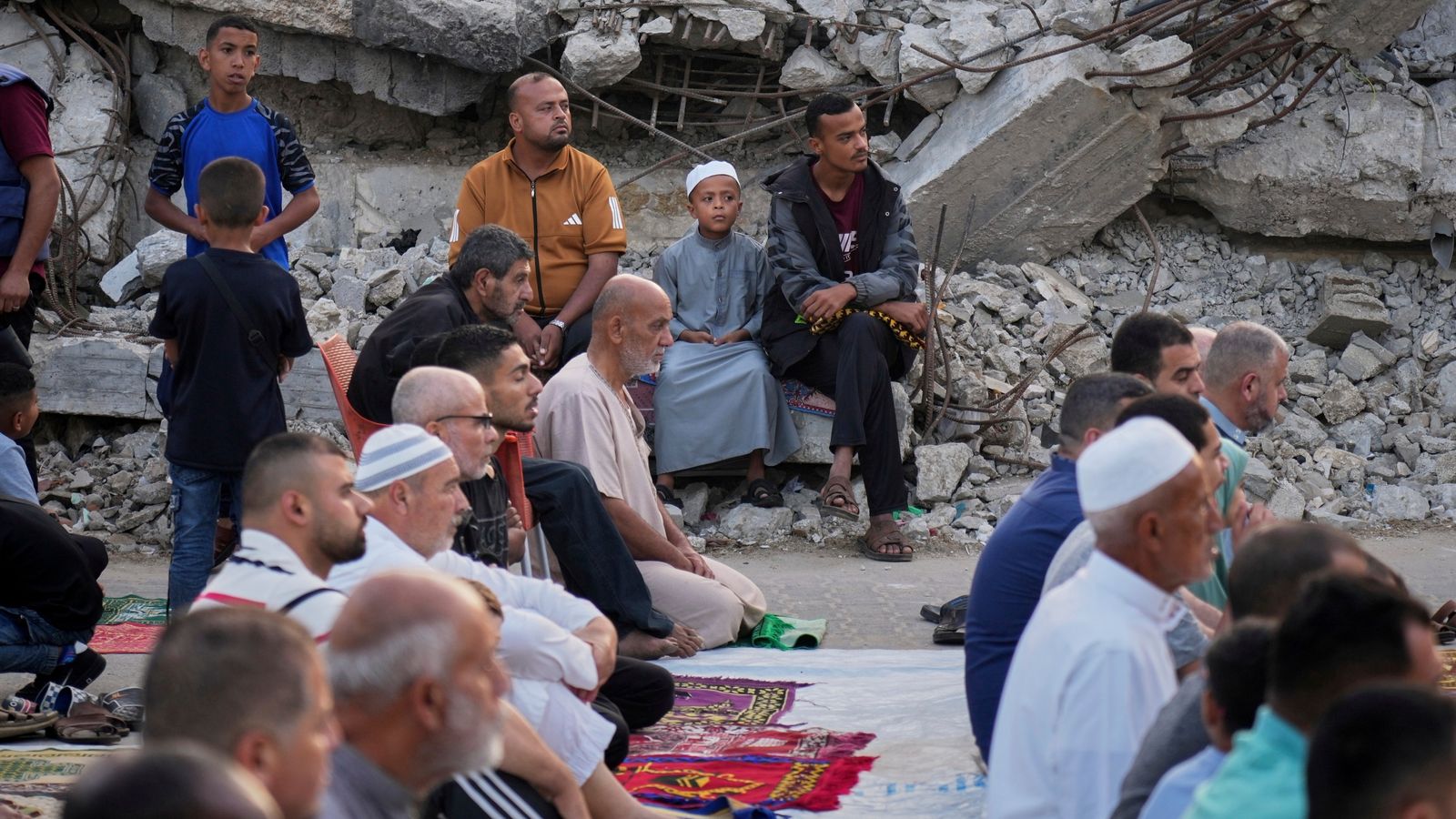 Daug Gaza melas griuvėsiuose, kai vyrai ir vaikai buvo priversti laikyti tradicines Eid Al Adha maldas atvirame ore, o maisto tiekimas mažėja.